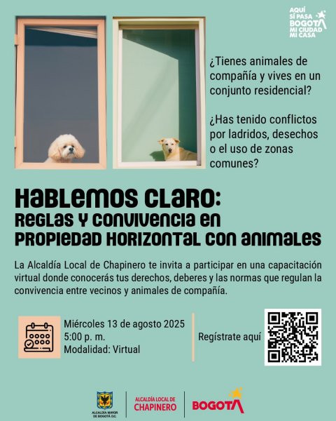 ¿Vives en un conjunto residencial y tienes animales de compañía? ¿Has tenido inconvenientes por ladridos, desechos o el uso de zonas comunes? Para resolver estas y otras inquietudes, la Alcaldía Local de Chapinero realizará una jornada virtual de capacitación ciudadana este miércoles 13 de agosto a las 5:00 p. m.