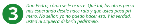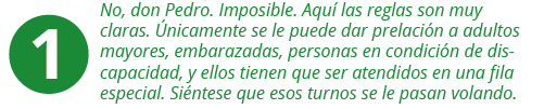 Don Pedro ha llegado a la oficina de atención al ciudadano de una entidad del Distrito. Cuando entra observa que van en el turno 456 y a él le ha tocado el turno 601. Mientras espera, se da cuenta que una de las personas que atiende es el hijo de un vecino. Se acerca a saludarlo, le preguntar por su familia y le pide que lo atienda ya porque tiene unas diligencias muy urgentes por realizar.
