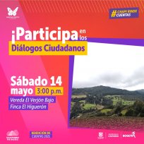 Tendremos Diálogos Ciudadanos en la Vereda El Verjón. Participa y conoce a detalle toda la gestión de la Alcaldía Local durante la vigencia 2021. Te esperamos a partir de las 3:00 p.m. en la Finca El Higuerón.