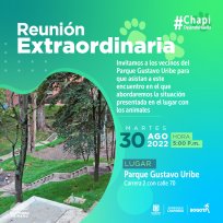 Atención vecinos y visitantes del Parque Gustavo Uribe: los invitamos a participar en la Reunión Extraordinaria que realizaremos para atender las alertas ciudadanas por presuntas afectaciones a la integridad de animales en el lugar. Los esperamos.