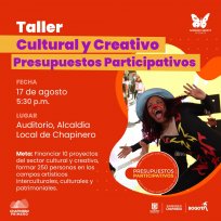 ¡Construyamos juntos propuestas culturales para Presupuestos Participativos! Si eres agente cultural, perteneces a una organización o colectivo y quieres hacer parte de la construcción de proyectos para mejorar Chapinero, este taller es para ti. Te esperamos