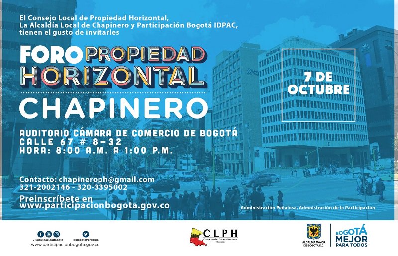 Con el objetivo de promover la convivencia entre los residentes de propiedad horizontal, el Instituto Distrital de la Participación y Acción Comunal (IDPAC) organiza el ‘Foro Local de Propiedad Horizontal en Chapinero’, el próximo sábado 7 de octubre, a partir de las 8:00 a.m., en el auditorio de la Cámara de Comercio de Bogotá (Calle 67 No. 8-32). Para asistir al foro, inscríbase en el siguiente link: https://goo.gl/L35RkV
