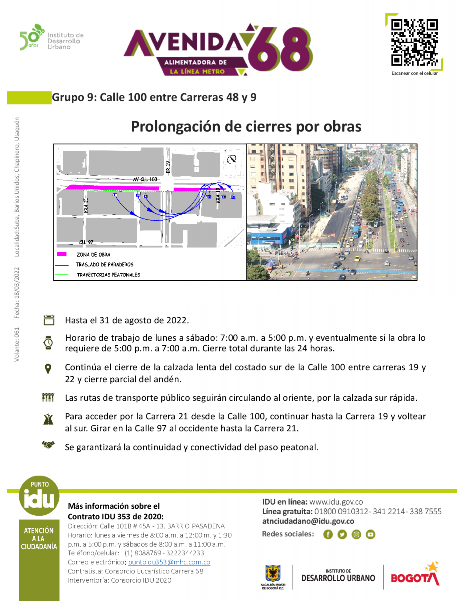 Se informa a la comunidad que se adopta prórroga de las obras que se adelantan en el sector de la Calle 100 entre Carrera 19 y Transversal 22 mediante Plan de Manejo de Tránsito hasta el 31 de agosto de 2022 (ver anexo); lo anterior, en el marco del proyecto y construcción de la Avenida 68, específicamente en el Contrato IDU 353 de 2020.