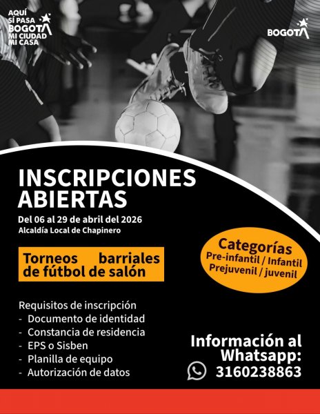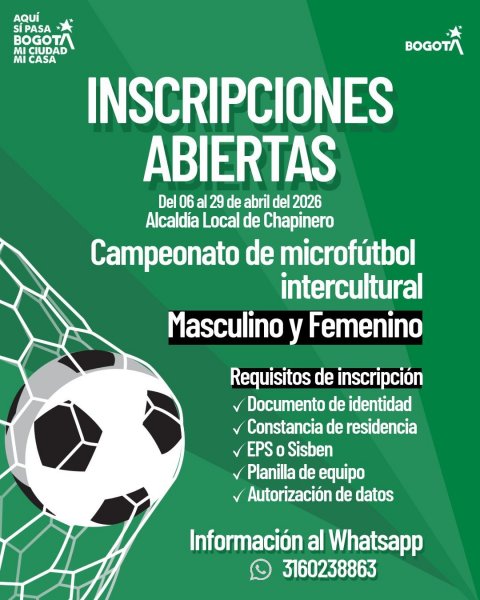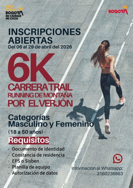 Del 6 al 29 de abril de 2026, los y las chapinerunas podrán inscribirse en iniciativas como la carrera trail de 6K por El Verjón, así como en torneos barriales de fútbol de salón y el campeonato de microfútbol intercultural, en categorías masculinas y femeninas a través del WhatsApp 3160238863.